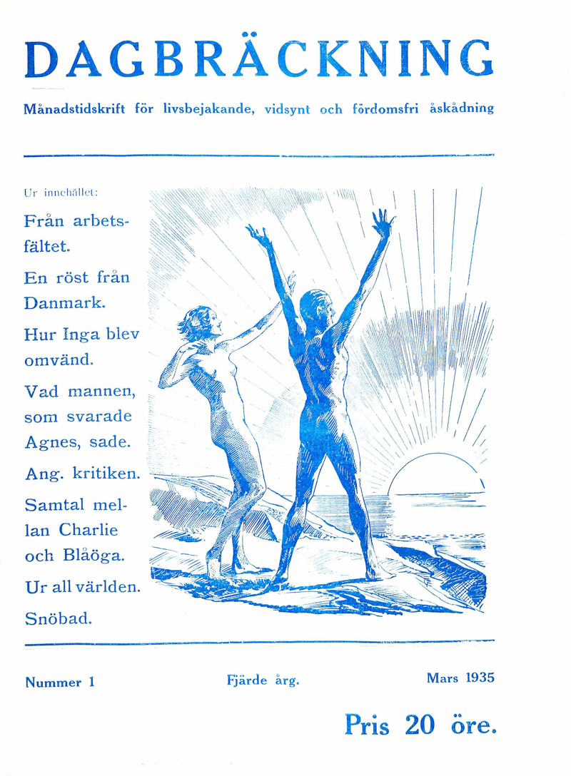 Almkvist, J. (1933, 15 mars). Nakenhetskulturens mål och medel. Natur och Hälsa: Organ för nakenhetskulturrörelsen 1(1), 2–3.