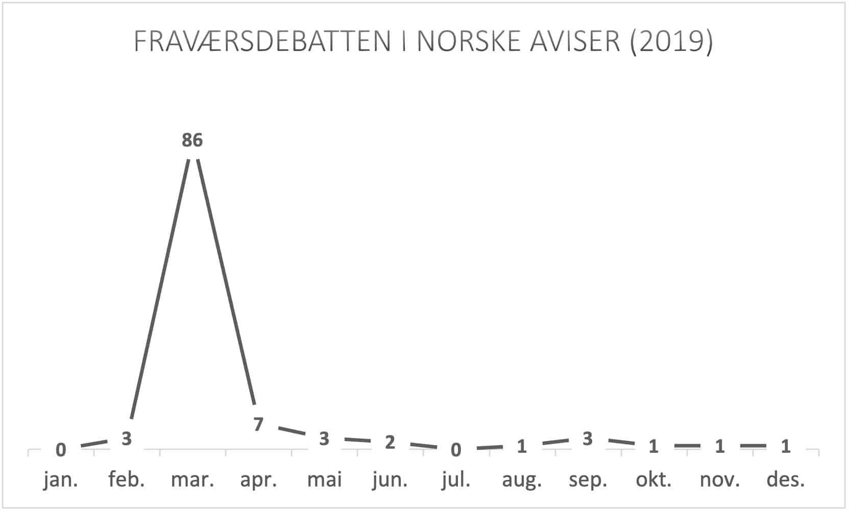 Artikkelen undersøker hvordan spørsmålet om skolestreikernes fravær ble debattert både i stortingssalen 12. november 2019 (Stortingstidende, 2019-2020, s. 497-507) og i avisene. Avisartiklene er funnet gjennom Retriever-databasen A-tekst. Her søkte jeg på fravær/fråvær og skole-/skulestreik* i alle lokale, regionale og nasjonale aviser i hele 2019. Kun meningsartikler (ledere, kommentarer, kronikker og leserbrev) er inkludert i utvalget, noe som gir 108 artikler, skrevet av journalister, (lokal)politikere, lærere, foreldre, besteforeldre og elever. Flertallet av artiklene ble publisert i mars 2019, samtidig som den første nasjonale skolestreiken fant sted. Kun to artikler er publisert etter at et stortingsvedtak ble fattet (Figur 1).