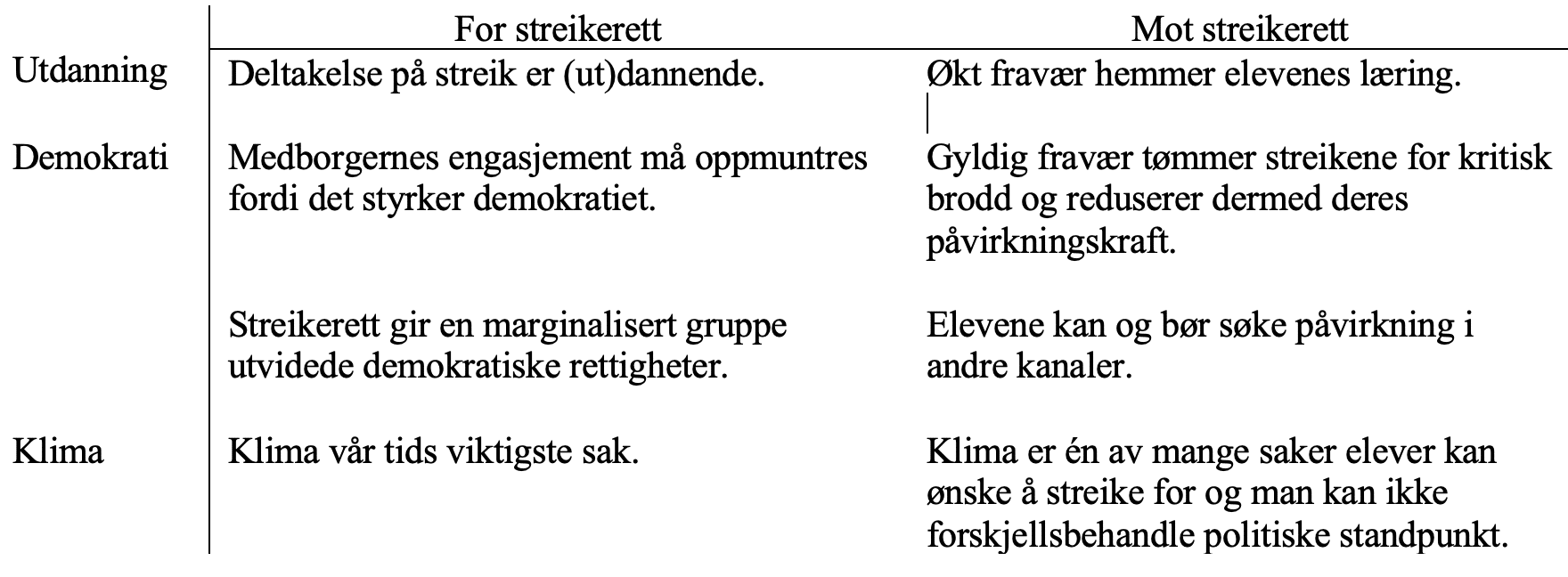 Stortingsrepresentantene som artikulerer et syn på demokratiet som en agonistisk praksis, og på klimastreikerne som systemkritiske medborgere, argumenterer for å gi elevene gyldig fravær for å streike. I motsetning til dette leder denne forståelsen avisdebattantene til å argumentere både for og mot å gi elevene gyldig fravær. I likhet med stortingsrepresentantene hevder enkelte debattanter at å innføre streikerett i skolen er avgjørende for å sikre barn og unge demokratiske rettigheter. Motsatt hevder andre at å anerkjenne streikene som gyldig fravær er å tømme dem for kritisk innhold og frarøve de unge retorisk handlekraft. Et illustrerende eksempel er redaktør Erik Stephansens (2019) argumentasjon for å anse skolestreikene som skulk: