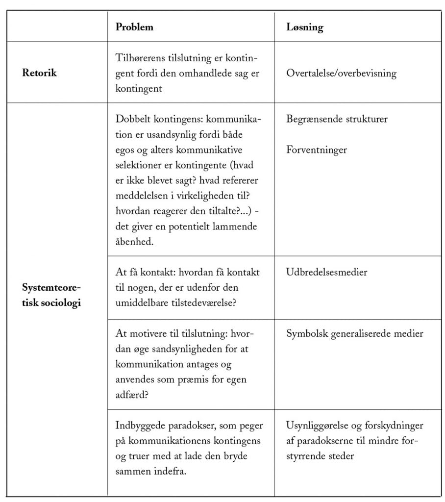 Tesen er som sagt, at man i retorik og systemteoretisk sociologi finder en fælles problematik om, hvordan sandsynligheden for, at kommunikation lykkes under kontingente vilkår, øges. Til gengæld finder man i de to traditioner ganske forskellige typer af svar. Hvor retorikken typisk analyserer, hvordan tekster/taler søger at opnå tilslutnig gennem overtalelse, der arbejder systemteorien med andre typer af svar.
