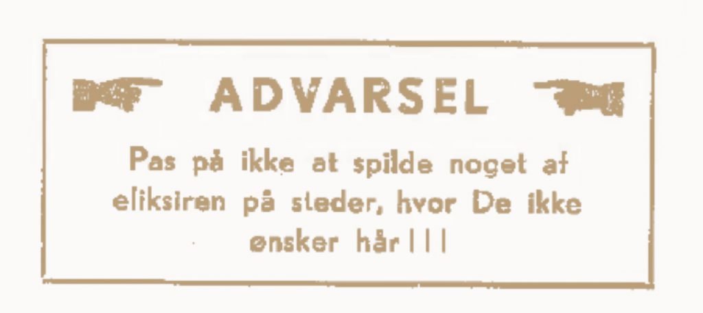 Når man ser etiketten, antager man uvilkårligt at der er en grund til advarslen mod at spilde væske. Den mest nærliggende grund springer frem i bevidstheden helt af sig selv: at væsken nok vil fremkalde hårvækst. Ellers giver det hele jo ikke mening.